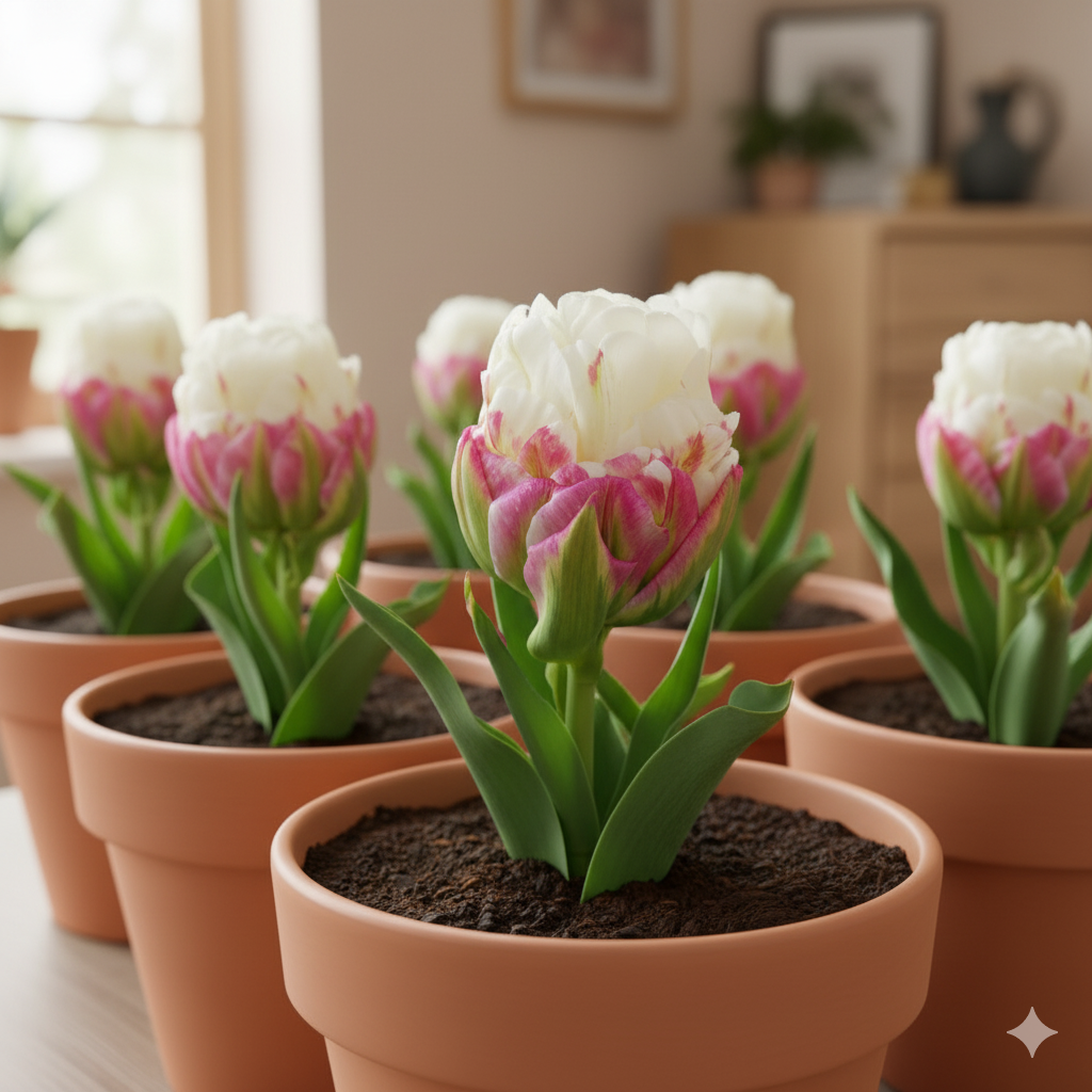 Для успішного вирощування тюльпанів «Ice Cream» у кімнатних умовах оберіть світле місце з м’яким, розсіяним освітленням.